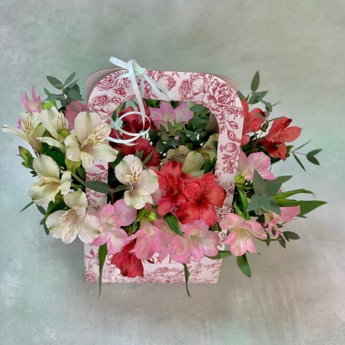 Красная коробка с альстромериями и зеленью