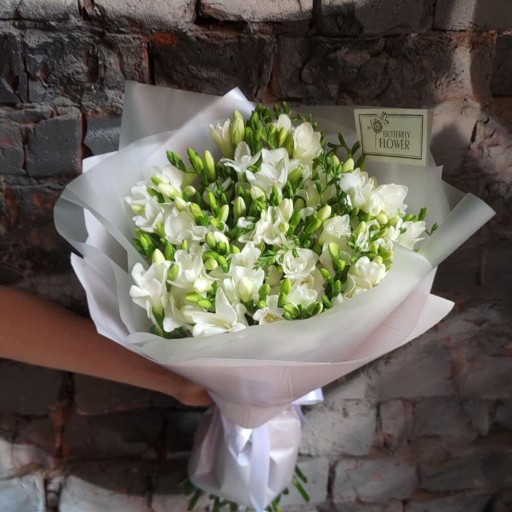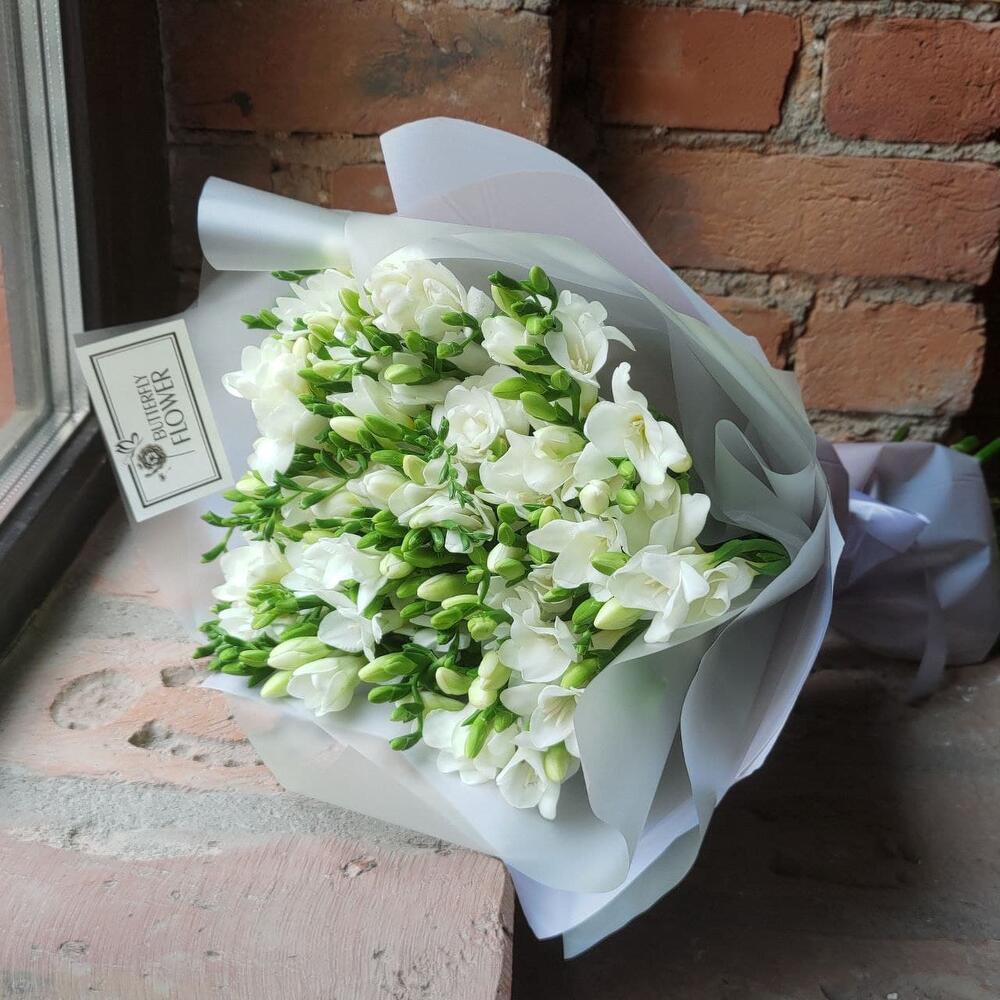 Букет из 45 белых фрезий в стильной упаковке “Фрея”