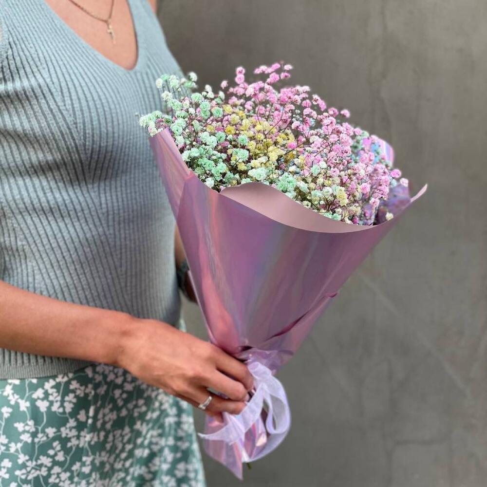 Лента атласная – 1 шт.Упаковка дизайнерская – 1 шт.Открыточка с вашими пожеланиями – 1 шт.гипсофила радужная – 5 шт.любовь флориста (бесплатно) – 1 шт.