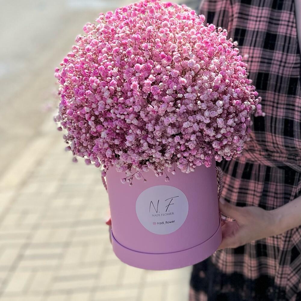 “Сиреневый туман” – композиция из гипсофилы в шляпной коробке