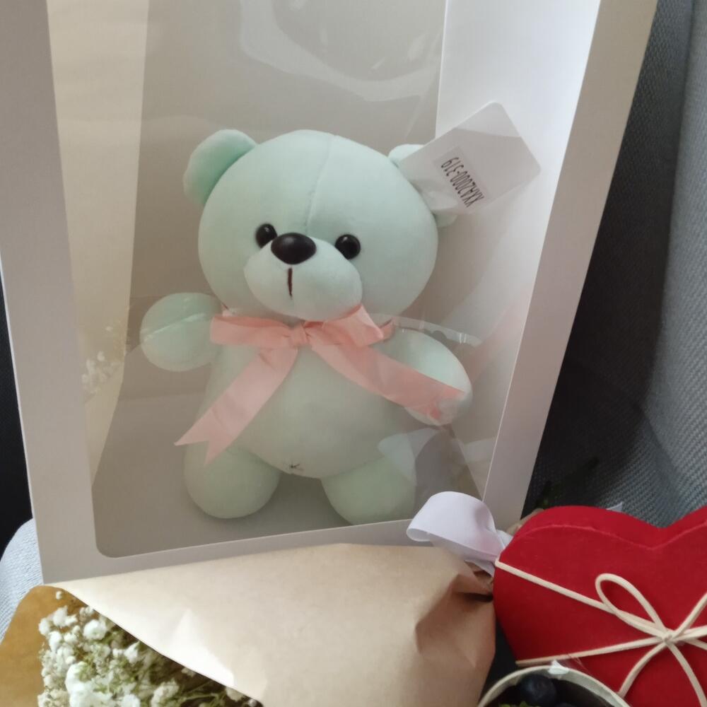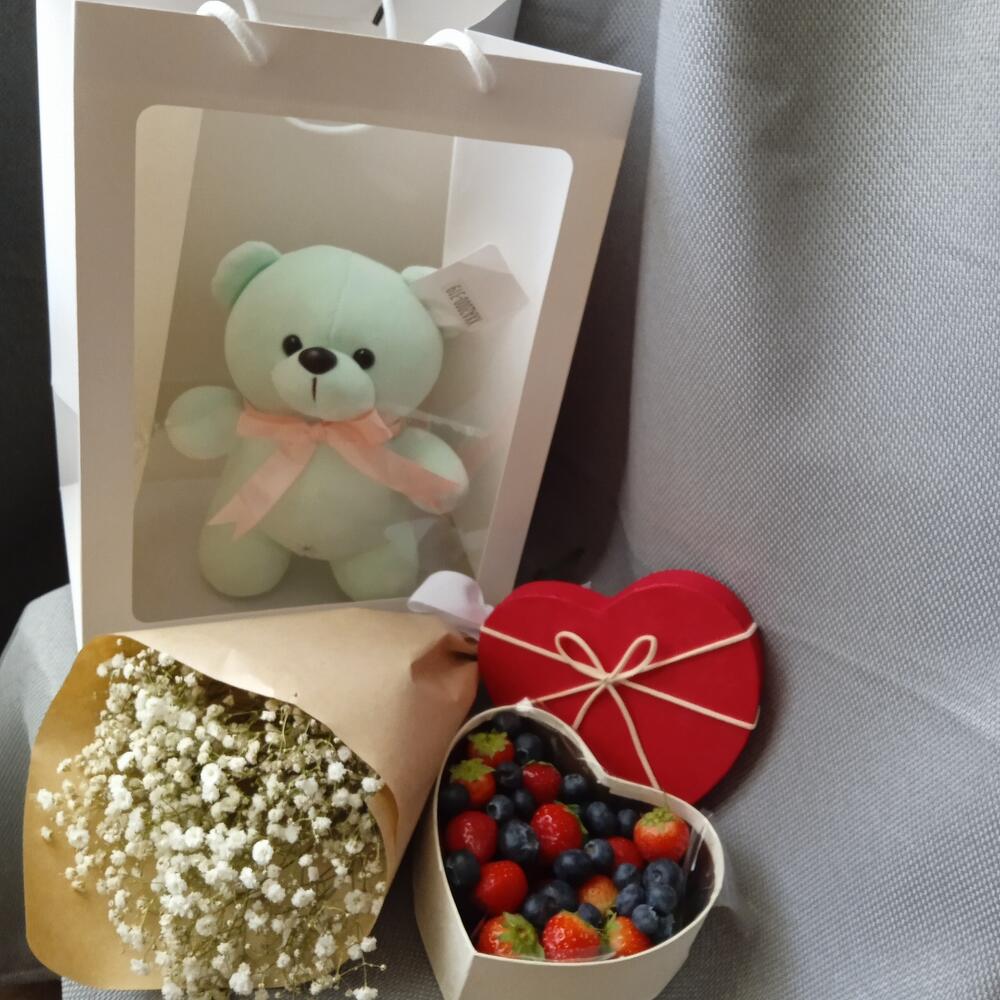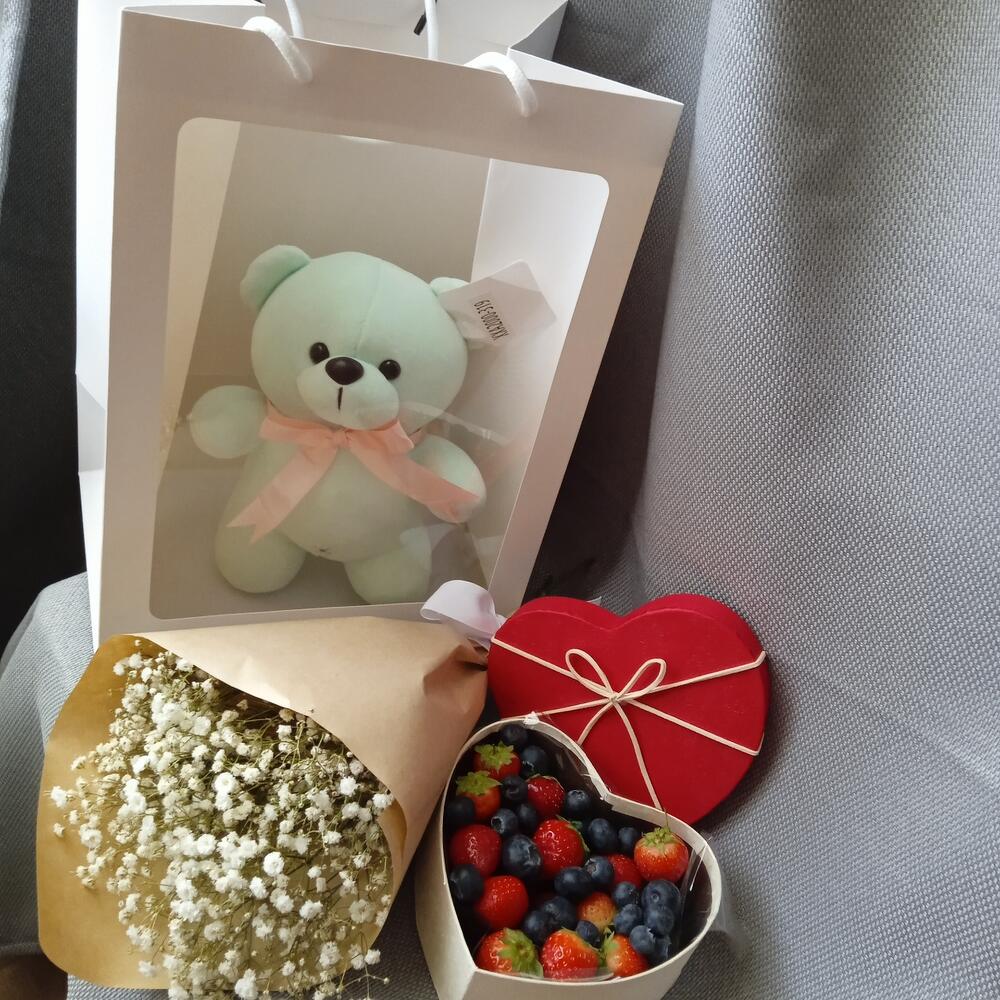 Гипсофила – 3 шт.Клубника – 250 гр.Лента – 1 шт.Голубика – 100 гр.Крафт упаковка – 1 шт.Пакет подарочный – 1 шт.Мишка плюшевый – 1 шт.коробка сердце маленькая – 1 шт.