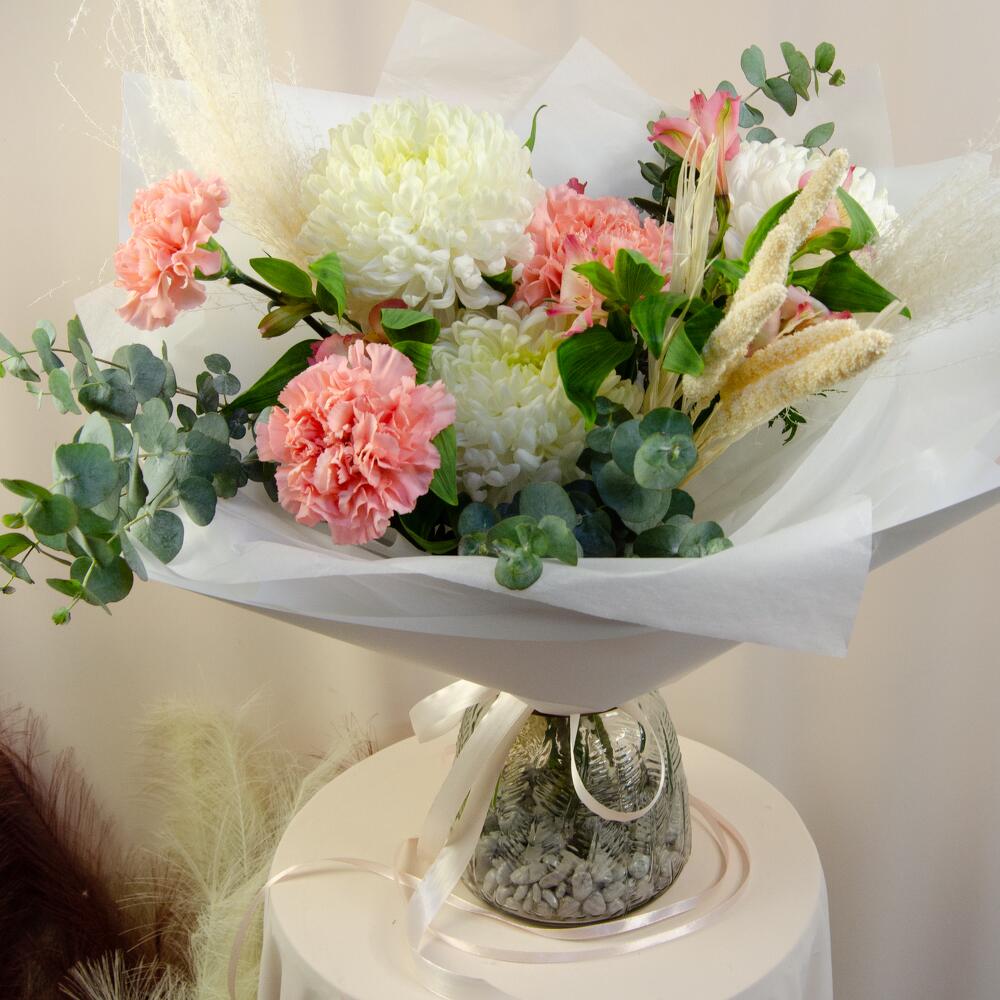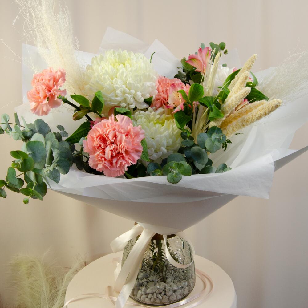 Альстромерия – 2 шт. Хризантема – 3 шт. Гвоздика – 2 шт. Гербера – 1 шт. Оформление – 1 шт. Седум – 3 шт. мискантус – 2 шт. сухоцветы микс – 1 шт.