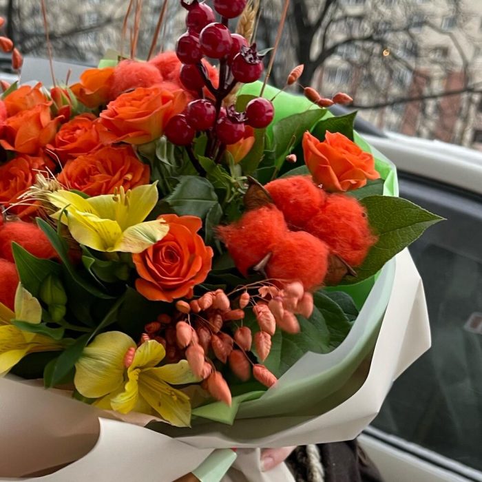 Кустовая роза оранжевая – 3 шт.Хлопок – 4 шт.Бриза – 5 шт.Пленка дизайнерская – 2 шт.Лента – 3 шт.Гвоздика сортовая – 1 шт.Альстромерия – 1 шт.Колоски пшеницы – 3 шт.Салал пучок – 1 шт.бриза оранжевый – 10 шт.Ягода декоративная – 1 шт.
