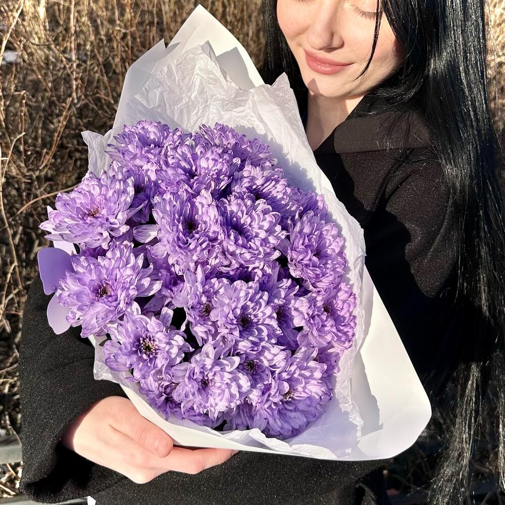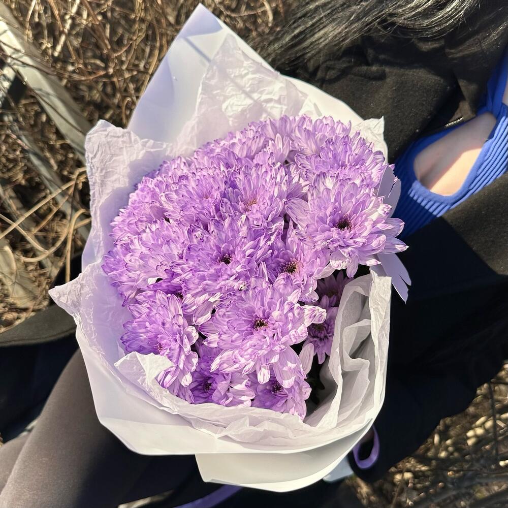 Лента атласная – 1 шт.Открыточка с вашими пожеланиями – 1 шт.Тишью белое – 2 шт.пленка матовая белая – 2 шт.хризантема кустовая крашенная фиолетовая – 5 шт.