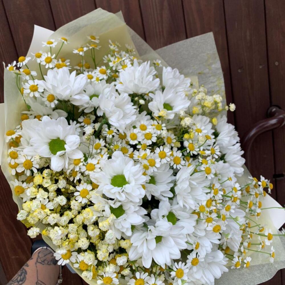 Хризантема кустовая – 5 шт.Матрикария (Ромашка Камила) – 5 шт.Гипсофила – 3 шт.Упаковка дизайнерская – 2 шт.Лента атласная – 2 шт.