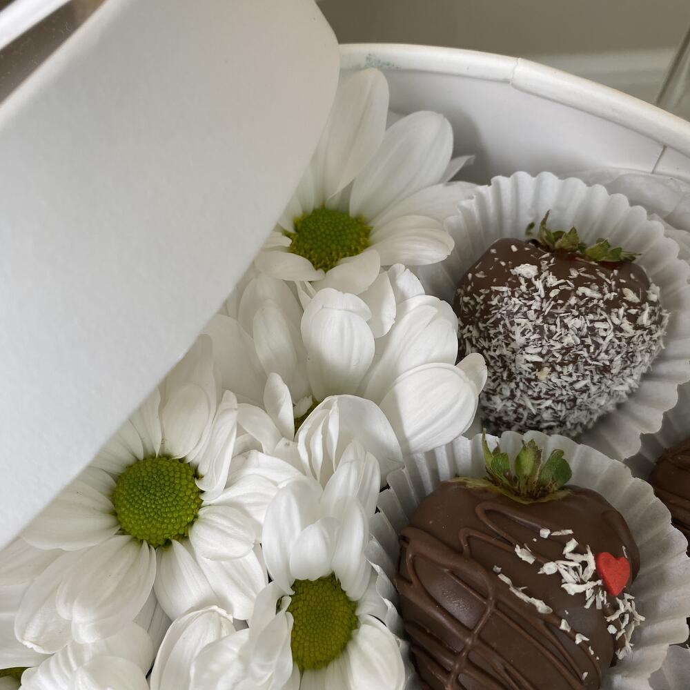 Милейший подарочный набор в круглой коробке с прозрачной крышкой хризантемы и клубники в молочном шоколаде, идеальный подарок, который никого не оставит равнодушным!Срок хранения клубники 24 часа при температуре от +2 до +8