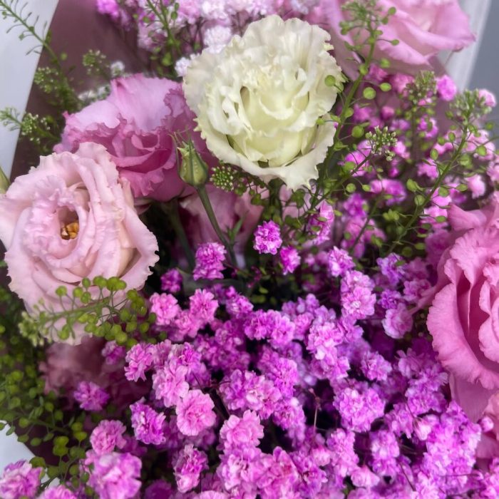 Эустома – 4 шт.Тласпи – 2 шт.Гипсофила – 2 шт.
