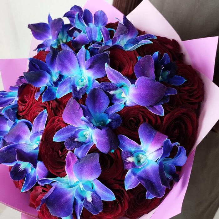 удлинитель для орхидеи – 13 шт.Средство для продления жизни цветов – 1 шт.Дизайнерская упаковка – 2 шт.инструкция по уходу за цветами – 1 шт.красные розы – 23 шт.орхидеи дендробиум цветки – 26 шт.любовь флориста (бесплатно) – 1 шт.