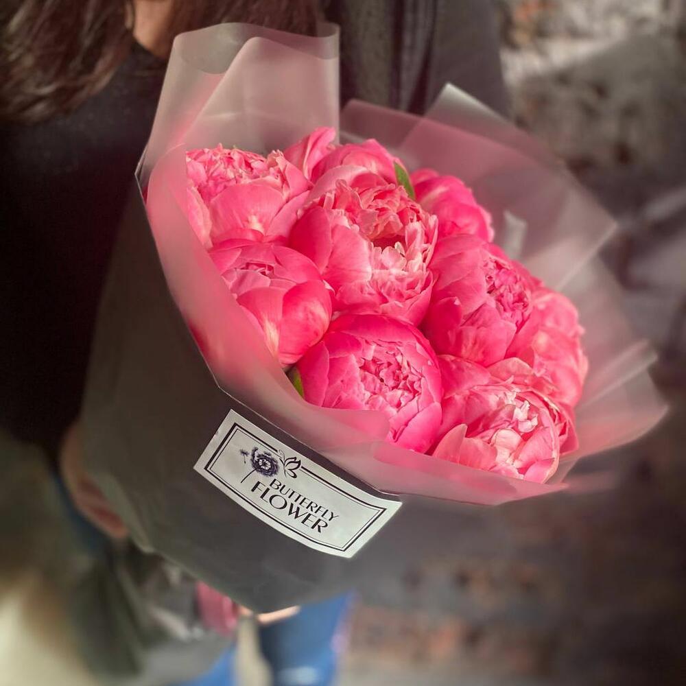 Букет из 9 ярко-розовых пионов в дизайнерской упаковке “Корал Шарм”