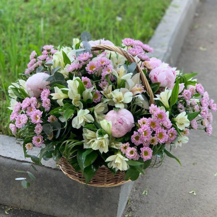 Корзина с пионами, альстромерией и сантини