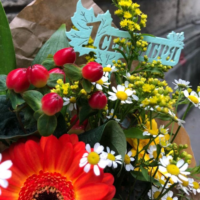 Гермини – 3 шт.Танацетум – 1 шт.Солидаго желтое – 1 шт.Рускус – 3 шт.Папоротник – 1 шт.Крафт упаковка – 1 шт.Лента атласная – 1 шт.