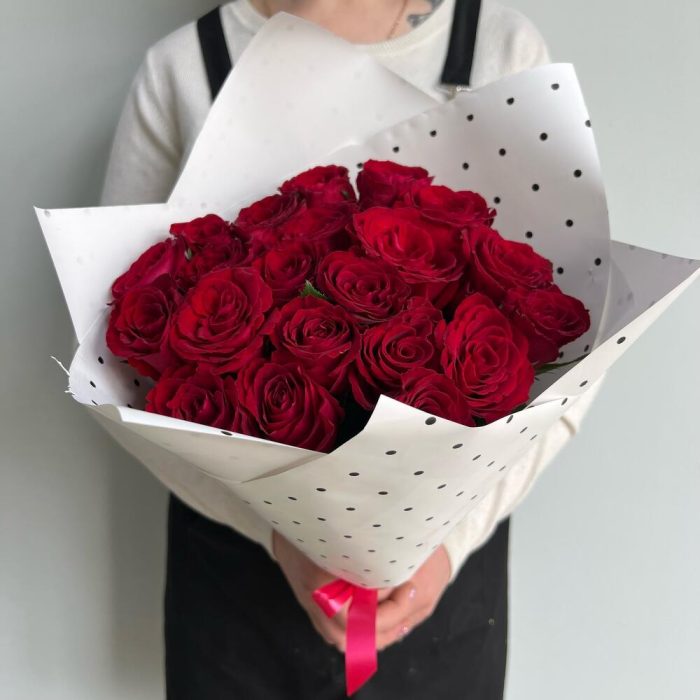Лента атласная – 1 шт.Упаковка дизайнерская – 2 шт.Роза 40 см – 21 шт.