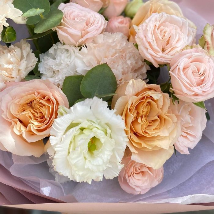 Лента атласная – 1 шт.Кустовая роза Бомбастик – 2 шт.Упаковка дизайнерская – 4 шт.Эвкалипт Микс – 3 шт.Роза шиммер – 3 шт.Диантус сортовой – 3 шт.антиринум – 2 шт.эустома алиса белая – 1 шт.