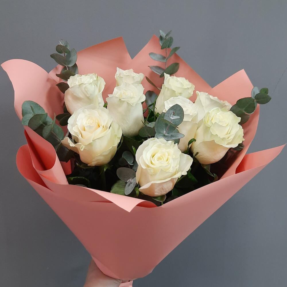 Белая роза и Эвкалипт ( 9 штук )