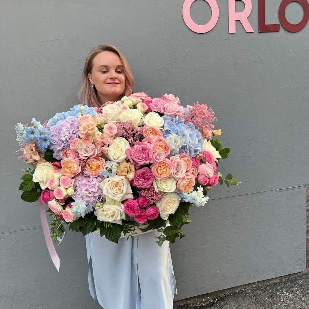 Большая корзина с гортензией, пион. розочками