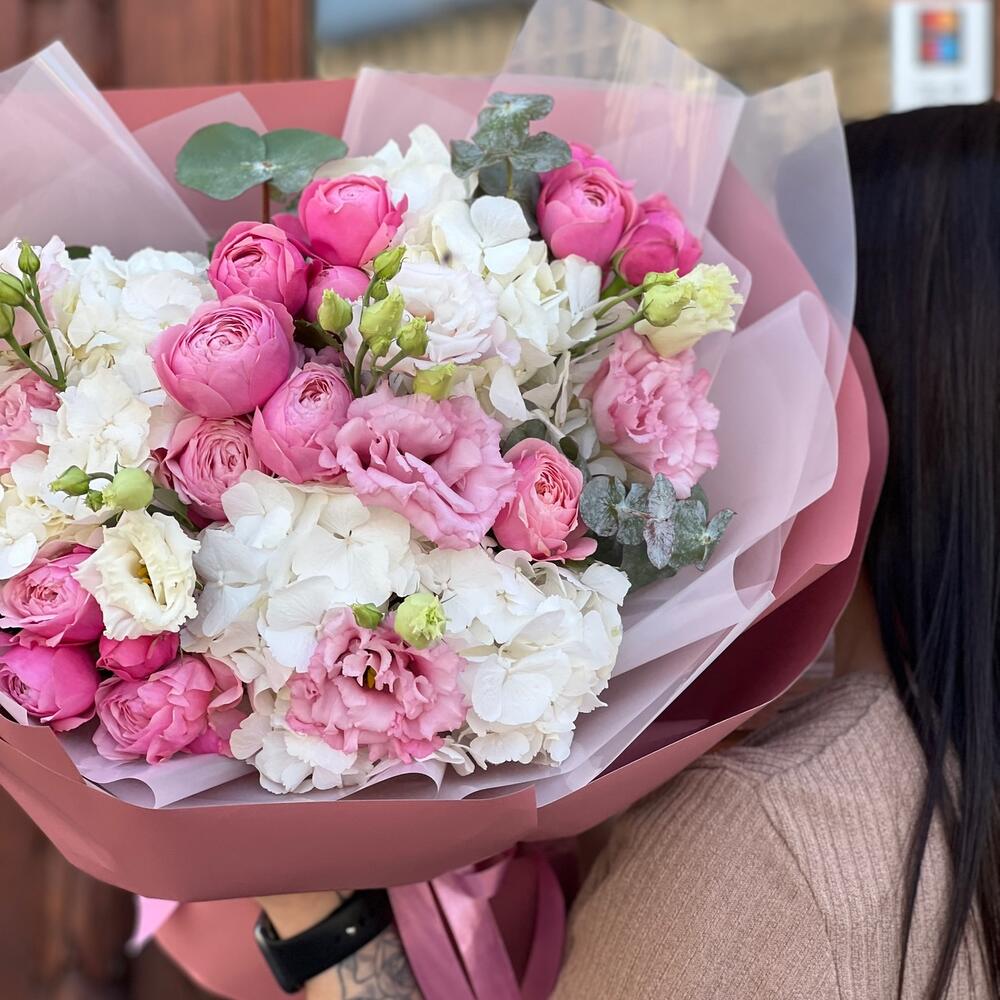 Гортензия – 3 шт.Эвкалипт – 3 шт.Лента атласная – 2 шт.Пленка матовая – 6 шт.эустома махровая розовая – 2 шт.роза пионовидная сильва пинк – 5 шт.