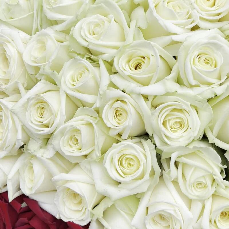 Роза красная 60 см – 101 шт.Роза белая 60 см – 50 шт.Лента атласная – 3 шт.