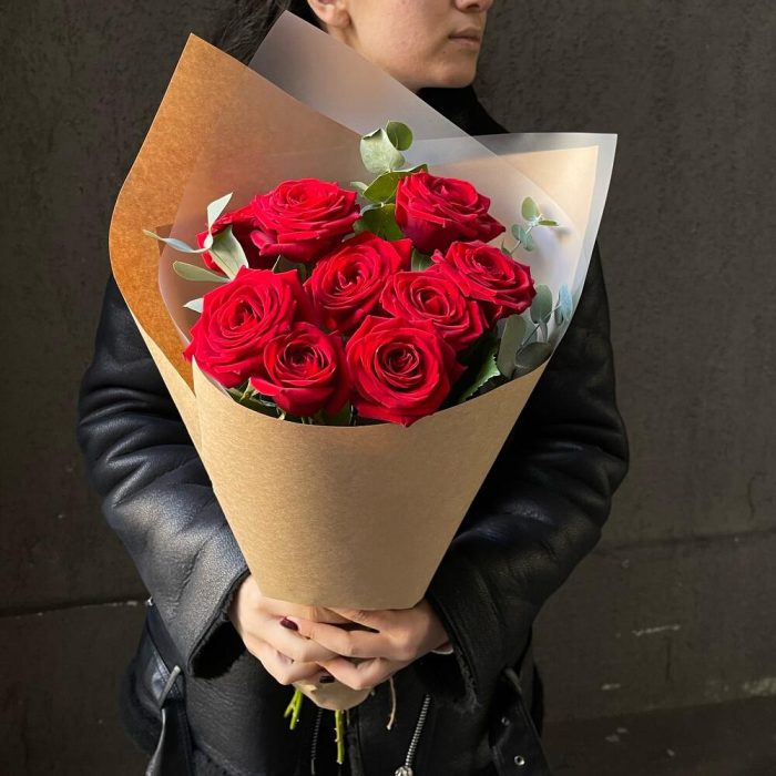 Эвкалипт – 3 шт.Упаковка дизайнерская – 3 шт.Роза красная 50 см – 9 шт.