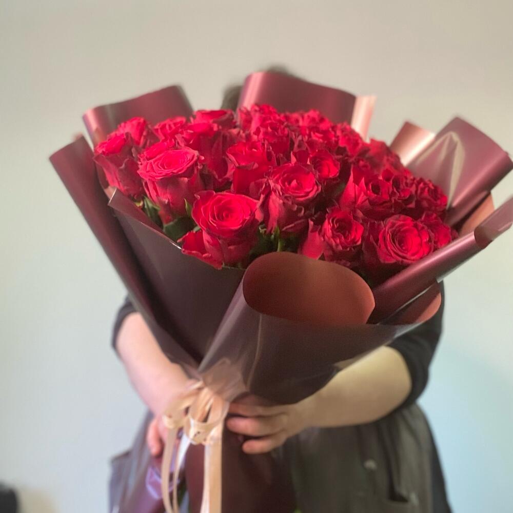 Лента атласная – 1 шт.Упаковка дизайнерская – 1 шт.роза кения – 31 шт.
