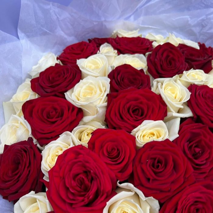 Роза красная 60 см – 29 шт.Роза белая 60 см – 22 шт.Дизайнерская упаковка – 5 шт.Тишью – 2 шт.Лента атласная – 2 шт.