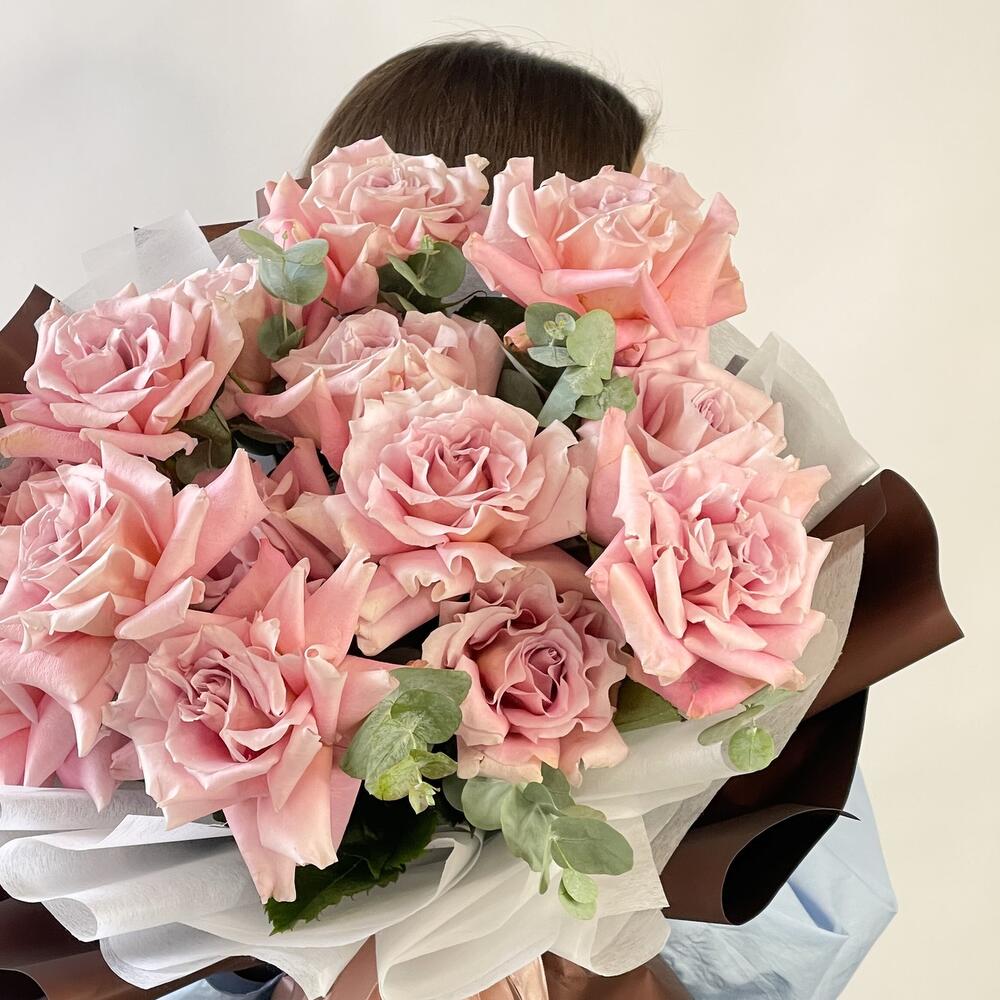 Лента – 3 шт.Эвкалипт – 3 шт.Роза – 15 шт.Упаковка дизайнерская – 4 шт.