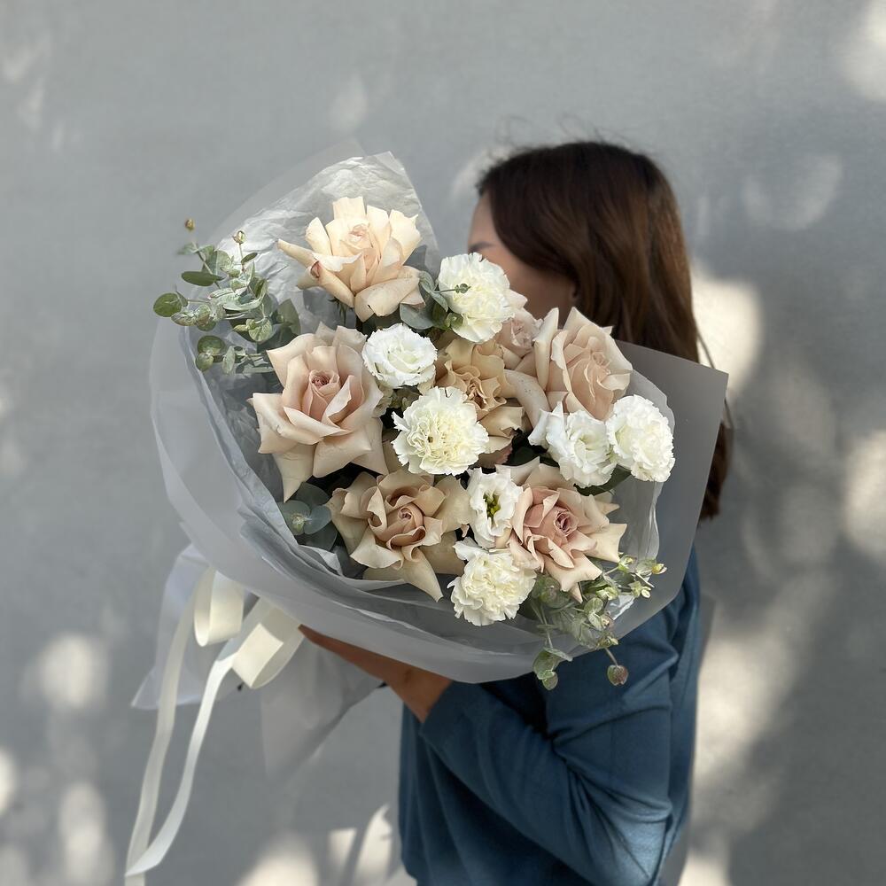 Альстромерии, Гвоздики, Кустовые розы, Лизиантусы, Розы, Хризантемы
