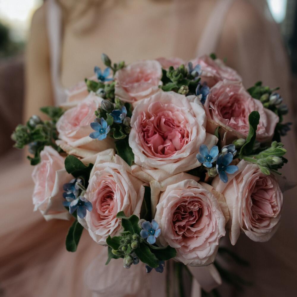 Пионовидная роза – 11 шт.Атласная лента – 1 шт.Оксипеталум – 9 шт.