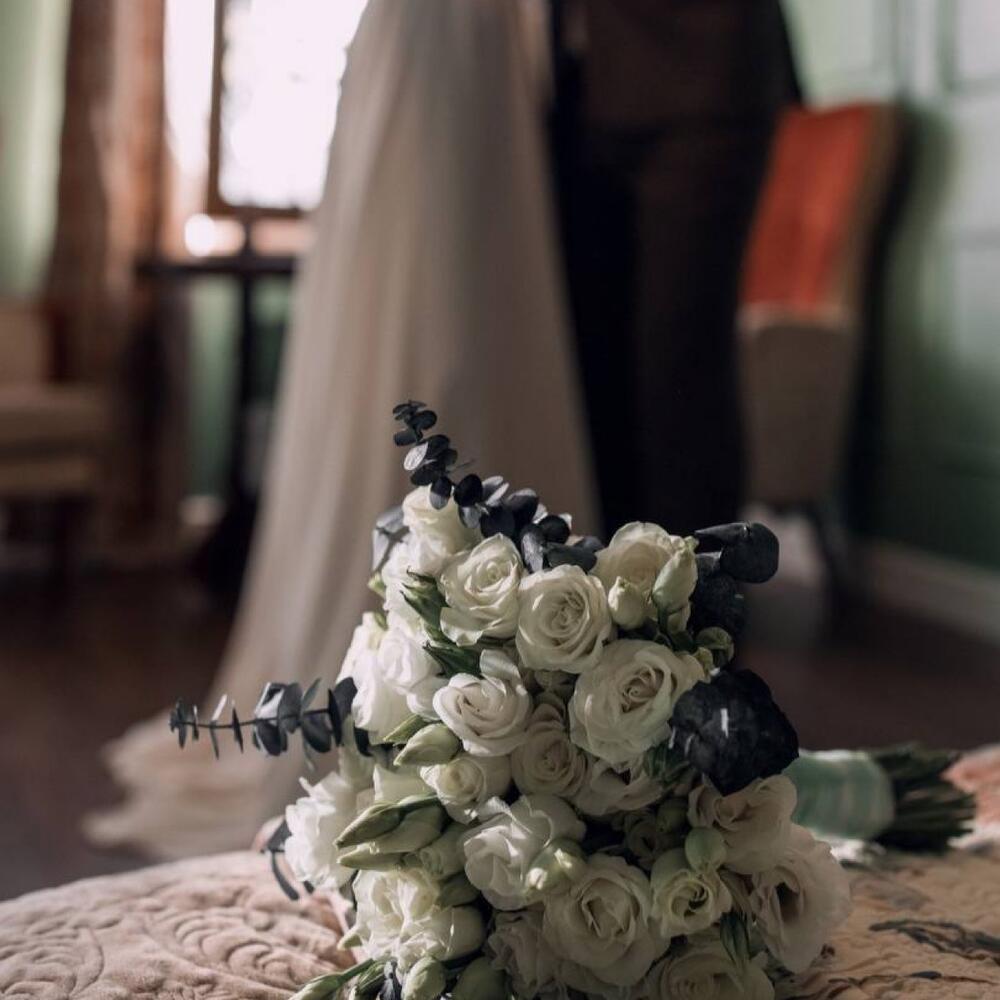 Лизиантус – 5 шт.Кустовая роза – 5 шт.Лента атласная – 3 шт.Эвкалипт Baby Blue – 3 шт.