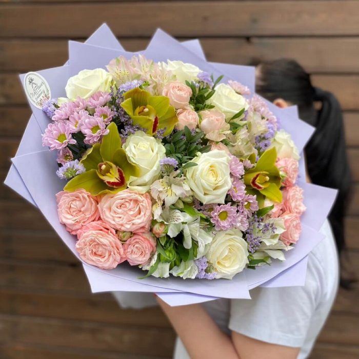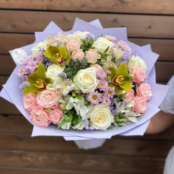 Альстромерия – 4 шт.Лимониум – 1 шт.Орхидея Цимбидиум – 3 шт.Писташ – 3 шт.Статица – 2 шт.Роза – 7 шт.Сантини – 3 шт.Бомбастик – 3 шт.Фоамиран (упаковка) – 1 шт.
