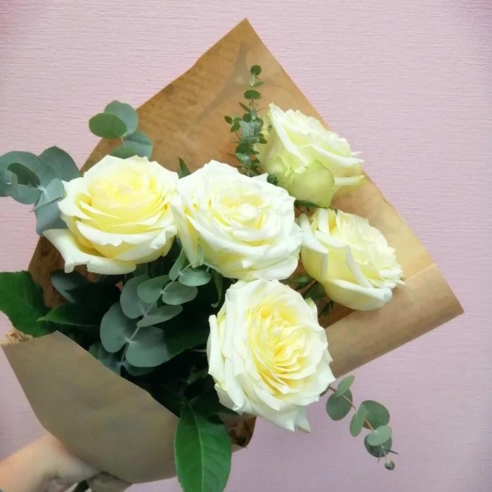 Роза пионовидная – 5 шт.Эвкалипт – 5 шт.Упаковка крафт – 1 шт.