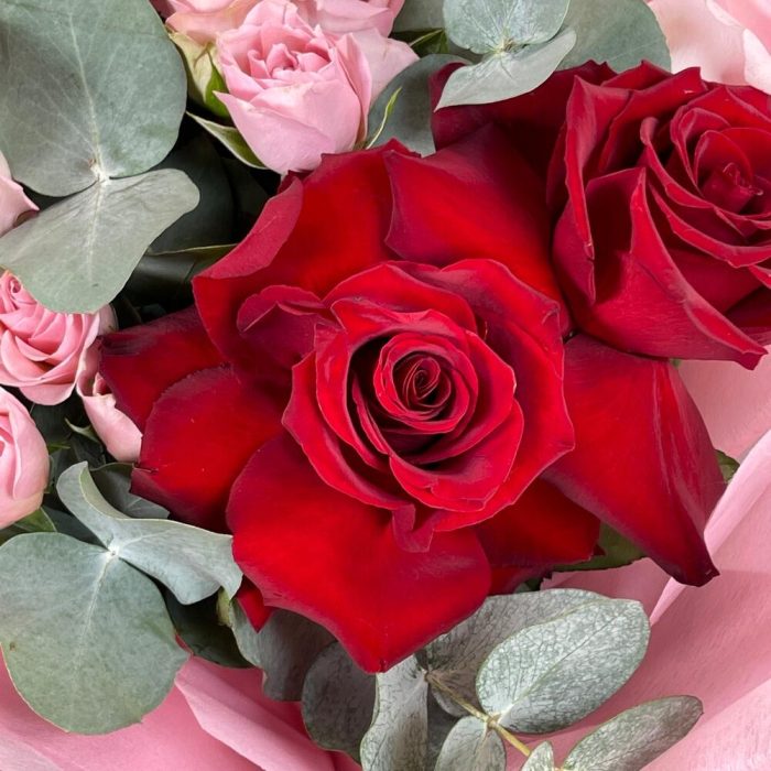Роза одноголовая – 5 шт.Роза кустовая – 3 шт.Эвкалипт – 2 шт.Упаковка дизайнерская – 2 шт.Лента – 2 шт.