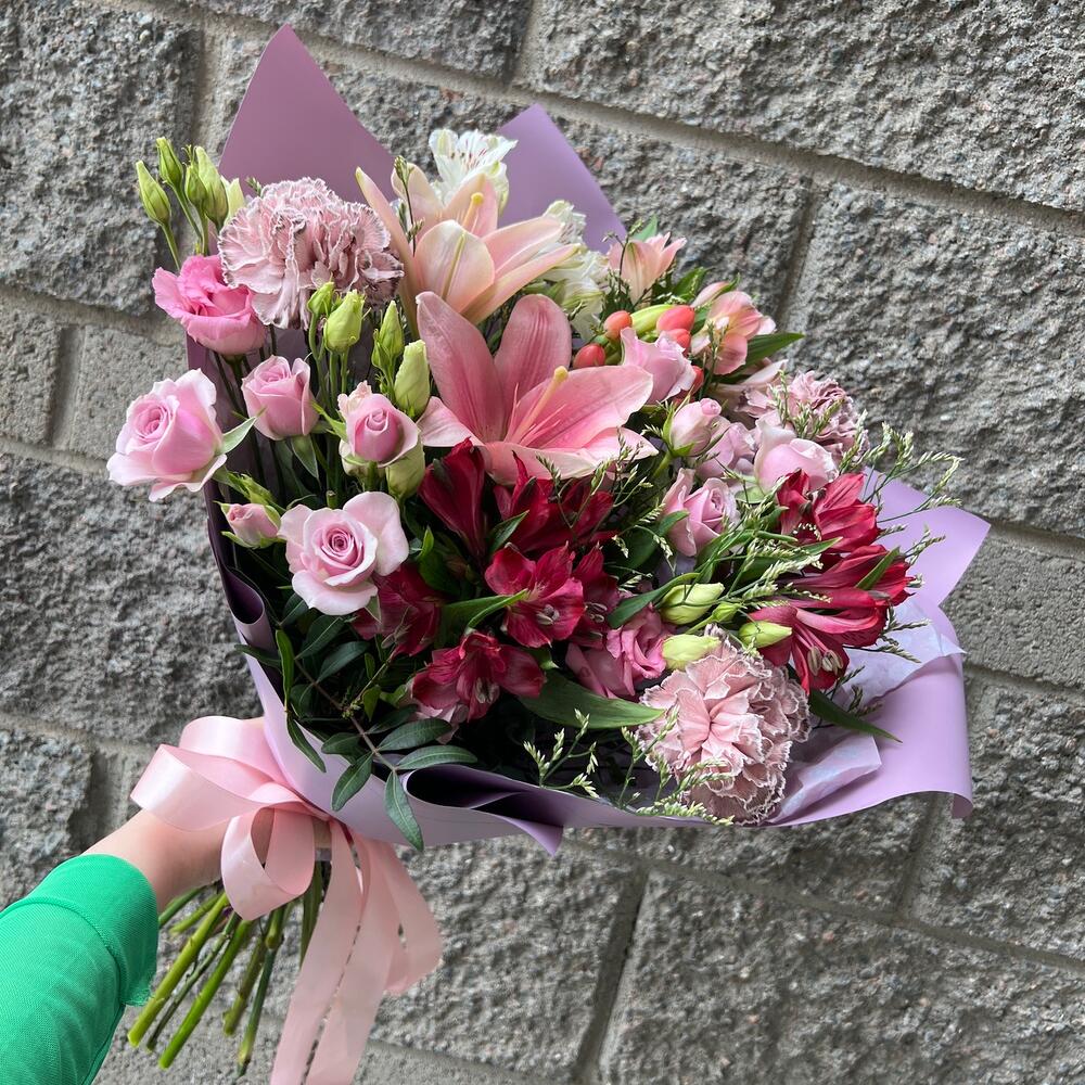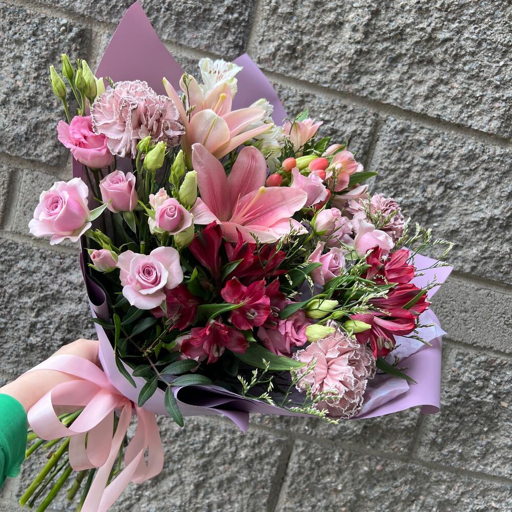 Букет с лилией ,альстромерией,диантусами,эустомой,гиперикумом,кустовыми розами и лимониумом