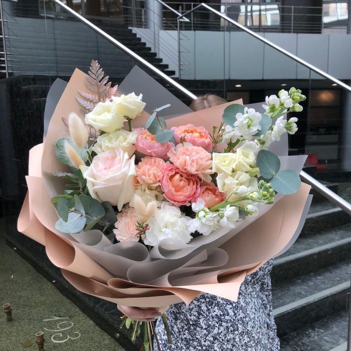 Роза кустовая джульетта – 1 шт.Маттиола белая – 2 шт.Лизиантус Алиса белый – 2 шт.Эвкалипт – 1 шт.Диантус – 3 шт.