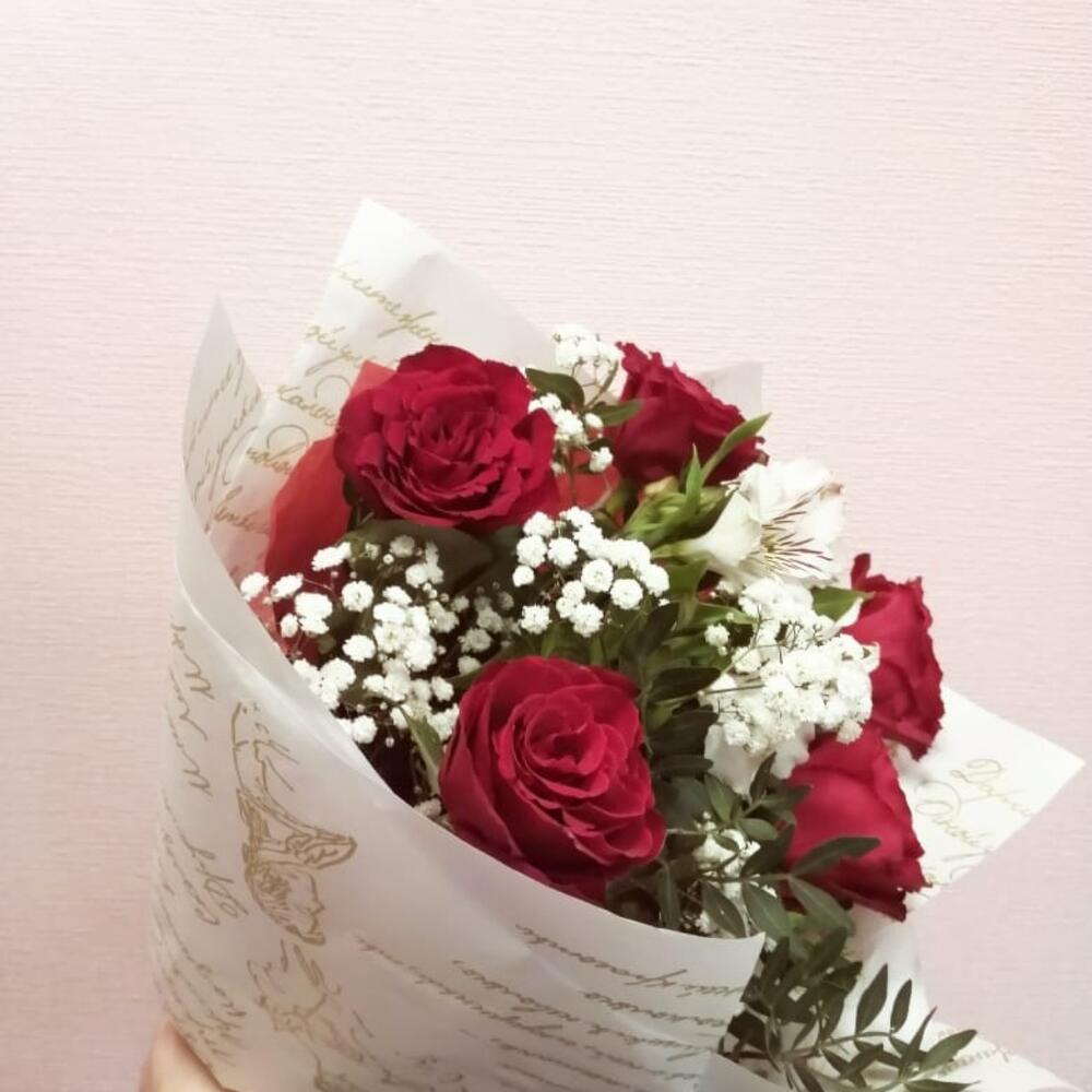 Роза – 5 шт.Альстромерия – 1 шт.Гипсофила – 1 шт.зелень декоративная – 2 шт.Упаковка – 1 шт.Лента – 1 шт.