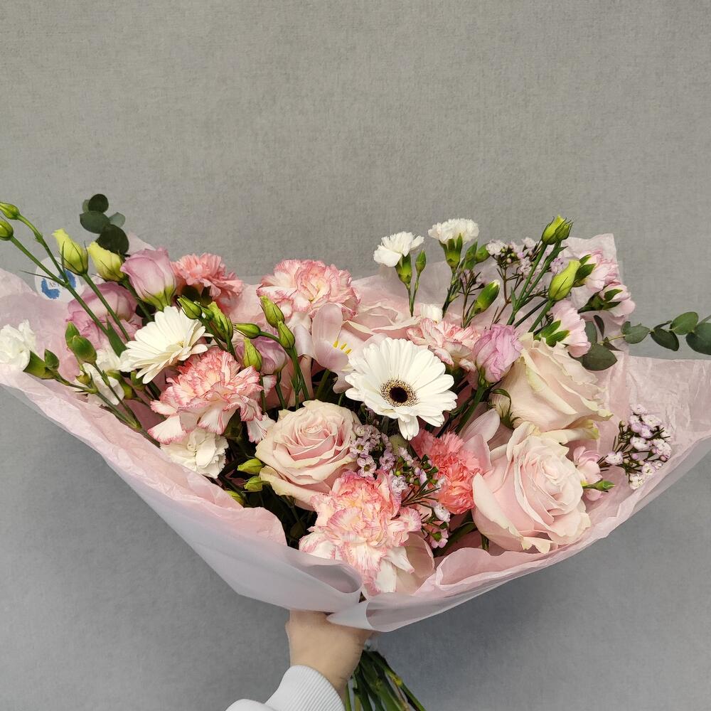 Роза пинк мондиаль – 5 шт.Гвоздика – 6 шт.Гвоздика кустовая – 3 шт.Гербера – 2 шт.хризантемы помпон – 1 шт.Тюльпан – 3 шт.Эустома – 1 шт.Хамелациум – 1 шт.Фисташка – 1 шт.Авторская упаковка – 1 шт.Атласная лента – 1 шт.