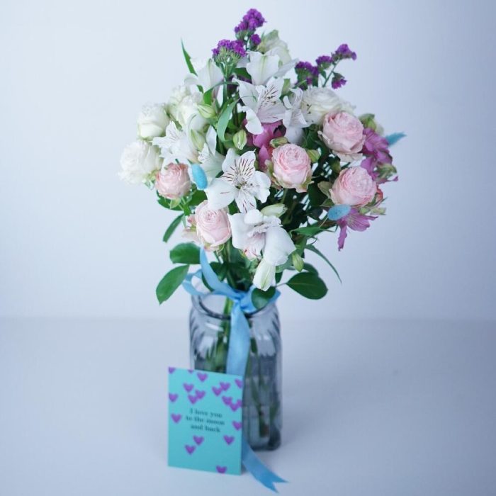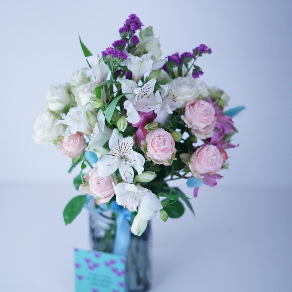 Альстромерии, Кустовые розы, Лизиантусы, Пионовидные розы, Розы, Ромашки