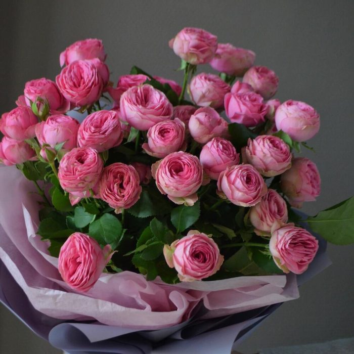 Букет из 9 кустовых пионовидных роз сорта Giselle, упаковка, атласная лента.