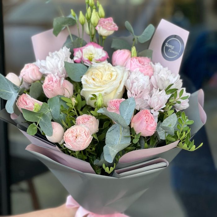 Альстромерии, Гвоздики, Кустовые розы, Лизиантусы, Розы, Хризантемы