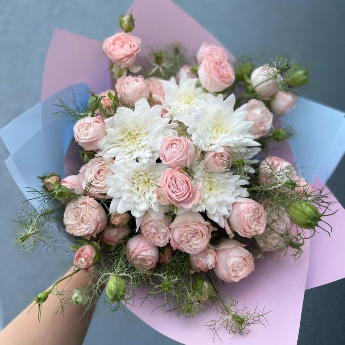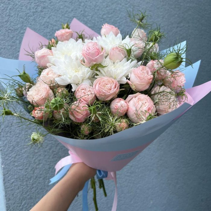 Spray rose – 7 шт. chrisantema – 7 шт. Decoration – 7 шт. packaging design – 1 шт. gift message card – 1 шт.