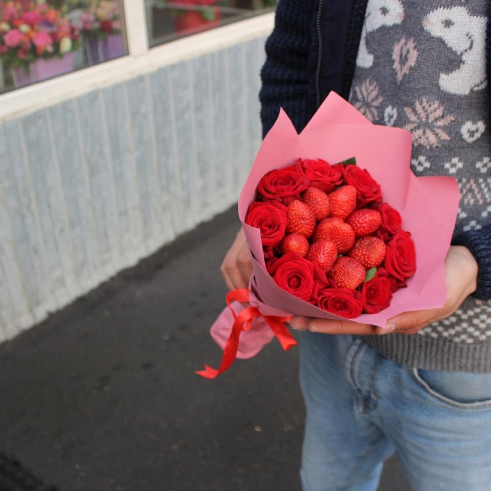 Нежный и миниатюрный букетик из роз и клубнички. Вкусно и ароматно.