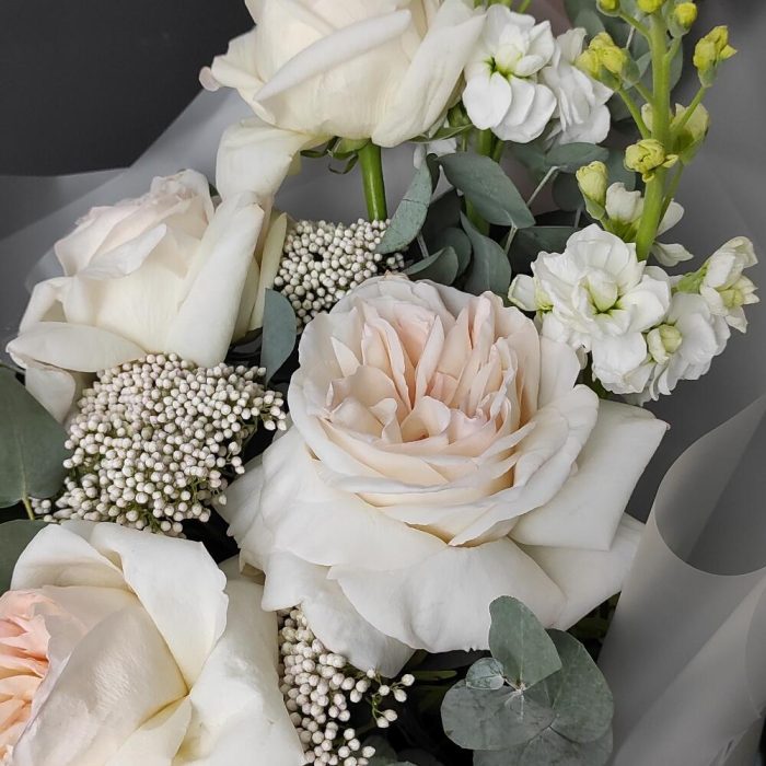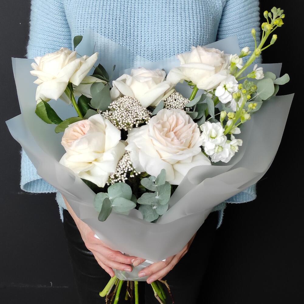 Маттиола – 2 шт.Озотамнус – 3 шт.Эвкалипт – 3 шт.Роза Эквадор – 5 шт.Упаковка дизайнерская – 2 шт.