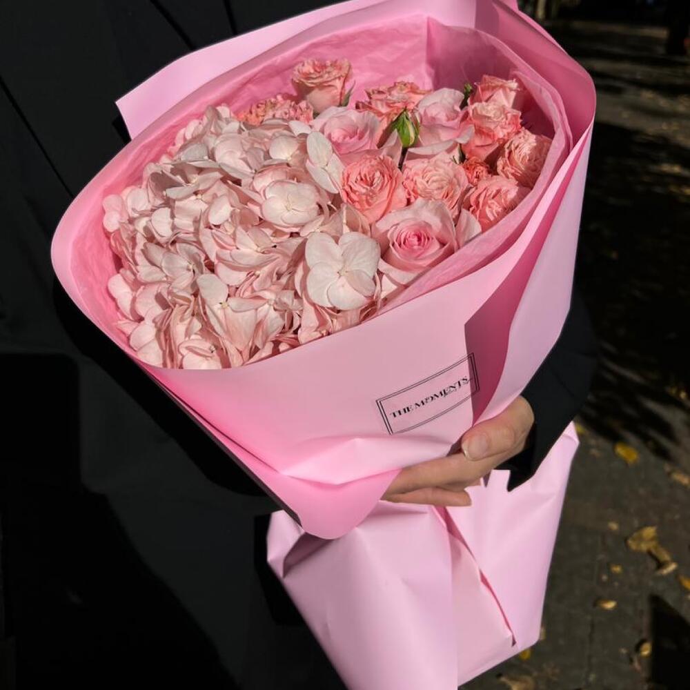 Гортензия – 1 шт. Роза – 3 шт. Кустовая роза – 4 шт. Упаковка дизайнерская – 4 шт.