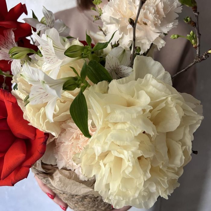 Альстромерия – 2 шт.Пион – 2 шт.Роза – 4 шт.Гвоздика – 3 шт.Оазис – 1 шт.Ветка – 1 шт.кашпо джутовое – 1 шт.
