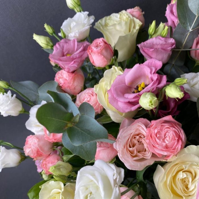Роза Эквадор – 7 шт.Роза кустовая пионовидная – 7 шт.Лизиантус – 7 шт.Рускус – 10 шт.Эвкалипт – 2 шт.Оазис флористический – 2 шт.Корзина большая – 1 шт.