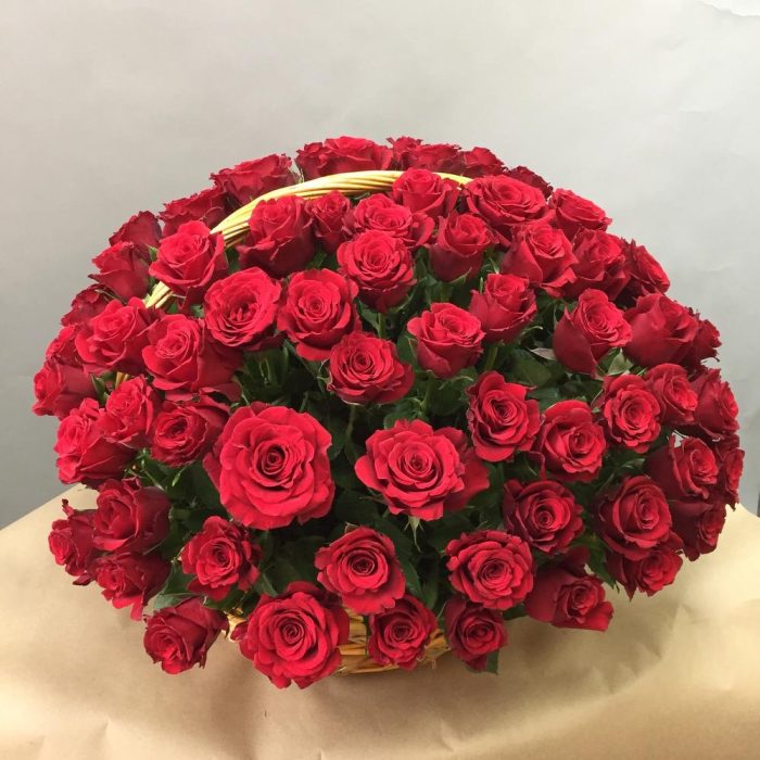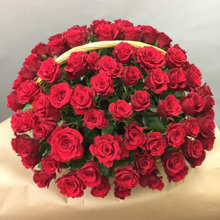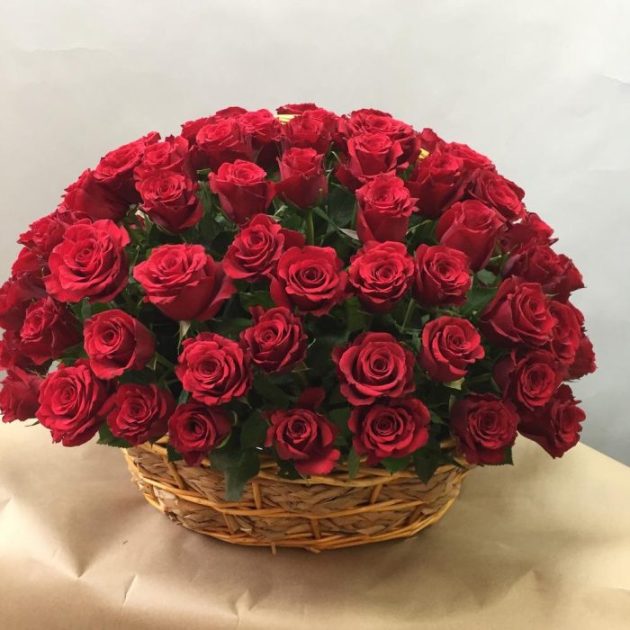 Роза – 101 шт.Корзина плетеная – 1 шт.Оазис – 10 шт.