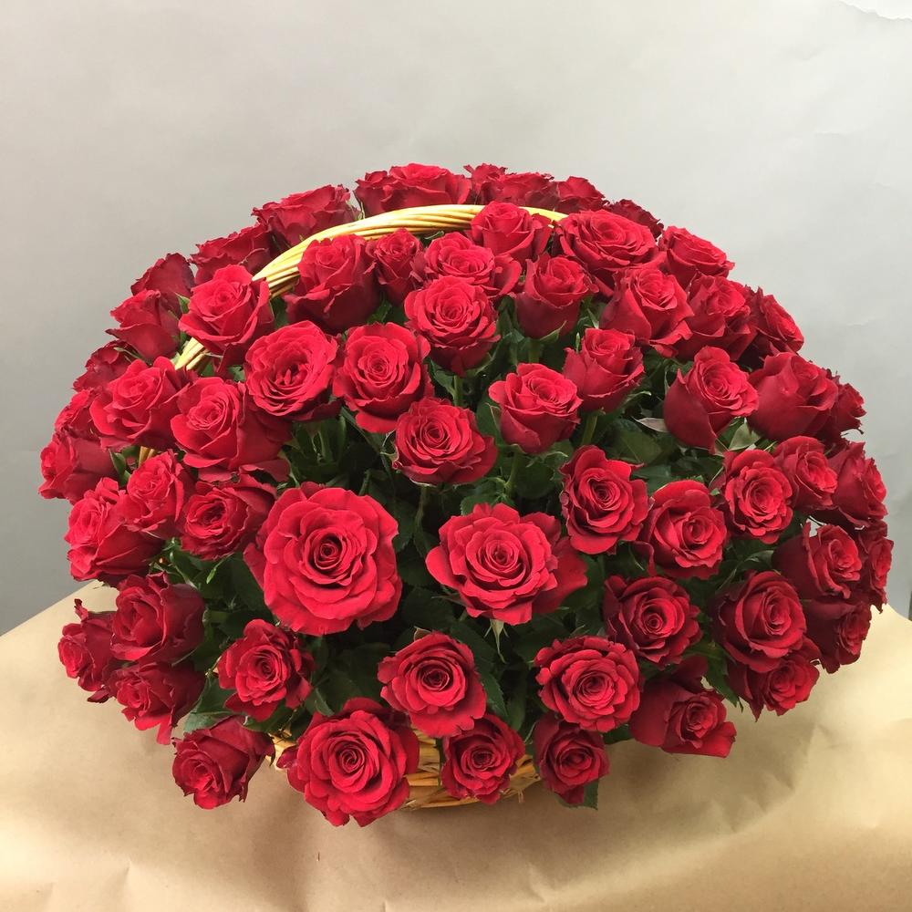 Метки: 101 роза, от 5000 руб, цветы в корзине