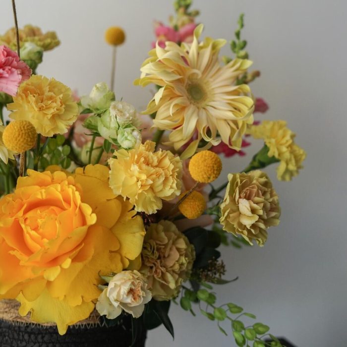 козина плетеная – 1 шт.Роза кустовая – 2 шт.Роза французская – 4 шт.гербера паста – 3 шт.Антуриум – 2 шт.Green bell – 5 шт.Диантус – 15 шт.Краспедия желтая – 5 шт.Лизиантус Алиса белый – 2 шт.
