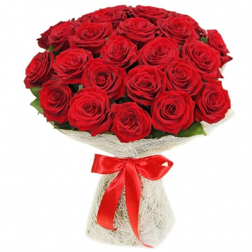 Атласная лента – 1 шт.Красная роза 50 см – 25 шт.Сетка белая – 1 шт.