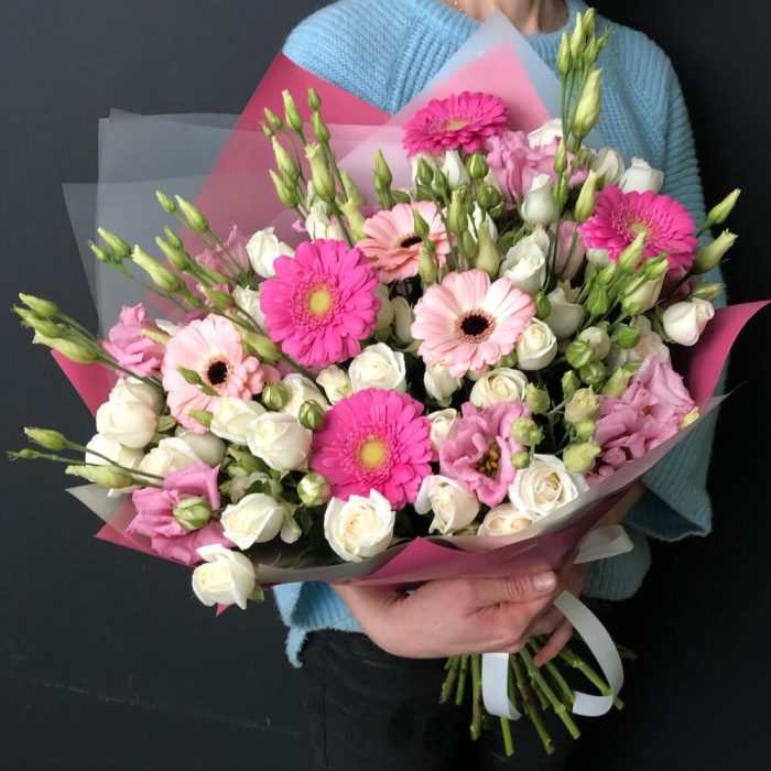 Роза – 9 шт.Лизиантус – 3 шт.Гербера мини – 7 шт.Упаковка дизайнерская – 3 шт.