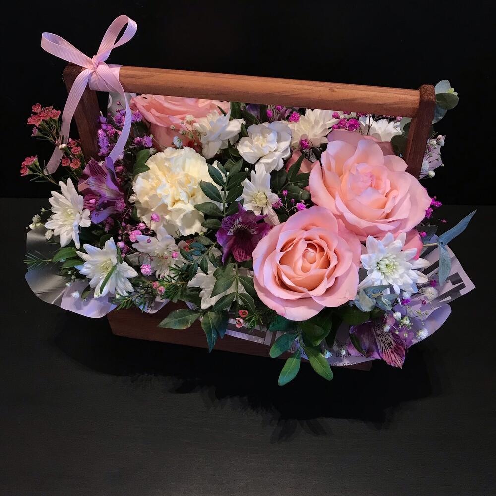 Ящик деревянный – 1 шт.Оазис флористический – 1 шт.Пленка матовая – 1 шт.Лента атласная – 1 шт.Роза Эквадор – 3 шт.Фисташка – 5 шт.Гипсофила – 1 шт.Диантус – 1 шт.Диантус кустовой – 1 шт.Хризантема кустовая – 1 шт.Альстромерия – 1 шт.Хамелациум – 1 шт.
